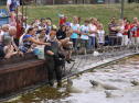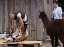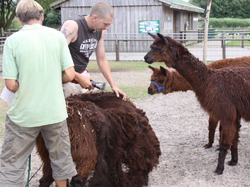 „Fassen Sie die Wolle ruhig an!“Gemeint war die Wolle der frisch geschorenen Quessant-Schafe, der kleinsten Schafrasse aus Frankreich, und die der Vierhornschafe. Bewunderung allerdings rief bei den zahlreichen Besuchern das feine Fell der Alpakas aus Südamerika hervor, die alle zwei Jahre im Park und dann auch zum Schaftag geschoren werden. Die Alpakas fanden das gar nicht lustig und wehrten sich teilweise heftig, trotz verhülltem Kopf, gegen die zwei Helfer und den „Friseur“.