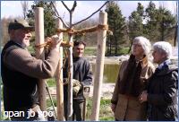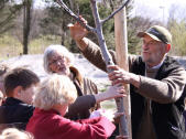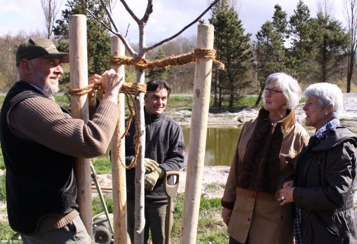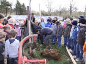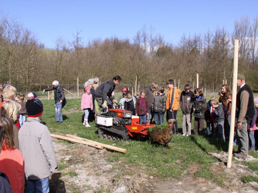 Mit Spannung verfolgten die Schüler die erste Pflanzaktion, denn es kam ein Gerät zum Einsatz, dass die Erde für den Pflanzballen aus dem Boden schnitt und sie als Halbkugel auf die Seite legte. Die Aussicht, vielleicht schon im Herbst die ersten Äpfel ernten zu können, ließ sie freudig wieder in ihre Klassen zurückkehren.