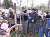 Meinolf Hammerschmidt (li) pflanzt den ersten Baum (Walnuss-) der Streuobstwiese im Beisein von Lehrerin Gönna Ludwig und Konrektorin Frauke Hansen und zwei Schulklassen