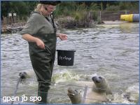 Auch am Nachmittag waren ganz viele Zuschauer bei der Seehundfütterung mit Geburtstagstorte anwesend, verfolgten interessiert die Informationen von Christa Dörholt und freuten sich über die Darbietungen der 8 Seehunde, denen Regenwetter auch nicht gerade gefällt, aber der „Belohnungshering“ schmeckt einfach super. Charlies und Sines kleine Seehundtochter – noch namenlos – hat inzwischen ein Areal für sich, denn unter den Großen würde sie noch keinen Fisch ergattern können. Vielleicht lässt Petrus dann zur Taufe die Sonne richtig scheinen! Seit der Eröffnungsfeier des Robbariums 2003 war es für Seehund Sammy das erste verregnete Geburtstagsfest.