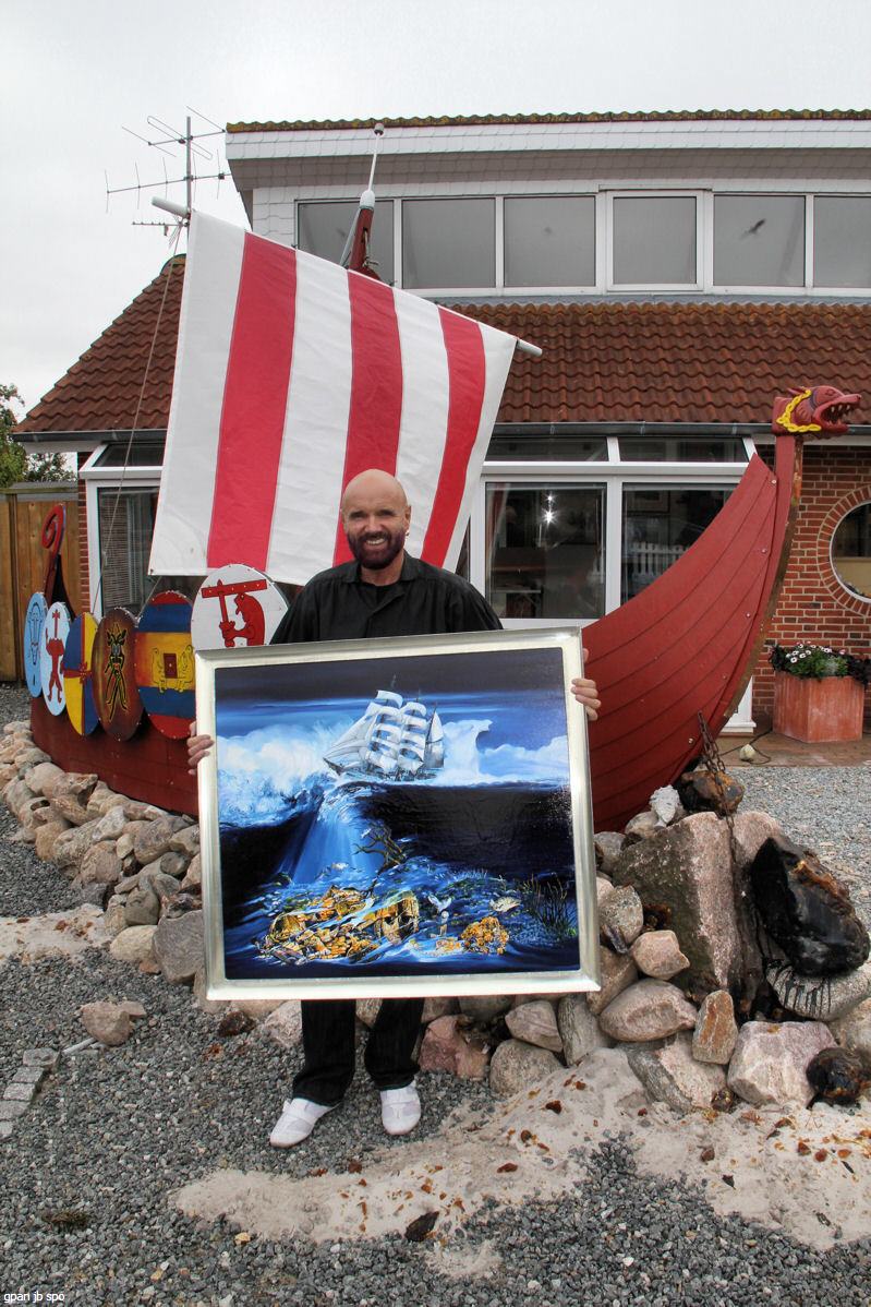 Erhard Schiel hat sich einen weiteren kleinen Traum erfüllt, ein „Wikingerboot“. Ein altes Boot aus Friedrichstadt, das er geschenkt bekam, brachte ihn auf die Idee. Es liegt jetzt umgebaut als Wikingerboot in der Bövergeest leicht schräg auf Steinen, ein weiterer Blickfang vor seiner Galerie. Fachmännische Hilfe erhielt er durch Nachbarn, Schiel selber konzentrierte sich auf die Gestaltung und Bemalung. Symbolisch steht es für Abenteuerlust und Wagnis. „Ich lese viel über das Leben unserer Vorfahren, interessiere mich für Geschichte, auch für die der Wikinger. Sie waren ja nicht nur Krieger und Plünderer, sie waren auch Bauern und Handwerker, Kaufleute und Entdecker. Ohne ihre besonders schönen und technisch ausgereiften Schiffe hätten sie nie ihre weiten Fahrten über die Meere unternehmen können.“