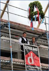 „Dat ik dat noch beleven dörf!“ Mit diesem Ausruf begrüßte Uwe Schwalm als Stellvertreter des Landrates die geladenen Gäste vor dem Erweiterungsbau an der Nordseeschule in der Pestalozzistraße. Er sei als Lehrer mit dieser Schule „gnadenlos verbandelt“ und freue sich, dass hier Klassen nach neuestem Standard mit bester Ausstattung entstehen. Optisch soll der Neubau das Aushängeschild der Schule werden. Er erinnerte an die Worte von Bürgermeister und Schulverbandsvorsteher Rainer Balsmeier, dass die Schule damit endlich „ein Gesicht“ bekomme. Dass die Schule jetzt auch über ein neues, gutes Energiekonzept verfüge, freue ihn als „Grünen“ besonders. Schwalm dankte den beteiligten Handwerkern, die kurz zuvor die Richtkrone angebracht und der Schule viel Glück gewünscht hatten, sowie den Ingenieuren und Architekten. Er dankte dem Kreis, der in schwieriger Zeit – Wechsel in der Schullandschaft, knappe Kassen – sich zu dieser klaren Entscheidung für St. Peter-Ording durchrang. Einen besonderen Dank richtete er an Ministerpräsident Peter Harry Carstensen, der sich persönlich für die Weiterverfolgung des Projektes eingesetzt habe. Er dankte dem Schulträger, der die Finanzierung der Lüftungsanlage sicher stellte, der Schule für ihr Verständnis, die unmittelbarer Nähe einer Großbaustelle auszuhalten. Anschließend lud er die Gäste zu einem kleinen Imbiss in die Mensa der Nordseeschule ein.