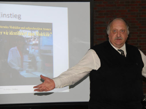 Das Projekt "Uni kommt zur Schule" soll Brücken zwischen Schule und Hochschule schlagen. Anschauliche Vorlesungen sollen Schülerinnen und Schülern Anreiz und Entscheidungshilfe für ein Studium im mathematisch-naturwissenschaftlichen, agrar- und ernährungswissenschaftlichen oder technischen Bereich bieten. Dr. Jürgen Neumann von der Nordseeschule verbindet damit auch die Erwartung, dass der Vortrag einer Fachautorität aus der Forschung, auf die Schülerinnen und Schüler motivierend wirken werde. So war denn die ganze Oberstufe der Nordseeschule in der Aula versammelt und wartete gespannt auf Professor Dr. Jürgen Grotemeyer von der Uni Kiel, Leiter des Instituts für Physikalische Chemie und Vorsitzender der Deutschen Gesellschaft für Massenspektrometrie. Dr. Jürgen Neumann begrüßte den Gast und stellte ihn als den Leiter des Institutes vor, das jährlich den an der Schule hergestellten “St. Peteraner Obstwein”, von Schülerinnen und Schüler der Oberstufe im Rahmen eines fachübergreifenden Projektes (Chemie/Biologie) hergestellt, prüfe. Ein anerkennendes Raunen ging daraufhin durch die Aula.