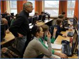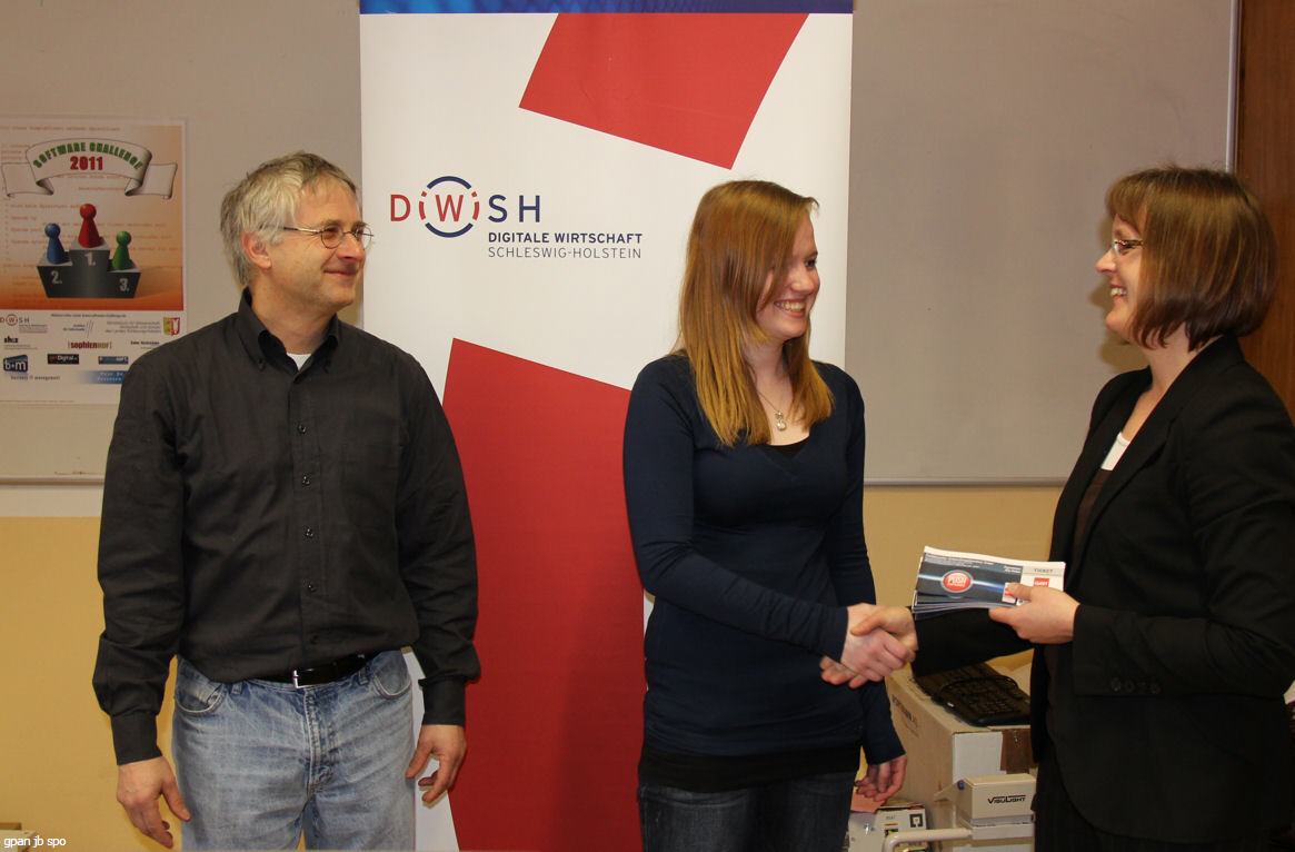 „Wir möchten gute Schülerinnen und Schüler motivieren, in Kiel Informatik zu studieren. Zur Zeit gibt es 28.000 offene IT-Stellen in Deutschland!“ Ulrike Pollakowski vom Institut für Informatik der CAU Kiel bietet auch an, bei der Vermittlung von Praktikumsplätzen zu helfen: „Wir brauchen vernünftigen Nachwuchs.“ Die Schülerinnen und Schüler der Informatikkurse aus der elften und zwölften Klasse der Nordseeschule hörten aufmerksam zu, freuten sich zunächst aber über ihren ersten Erfolg. Seit September nehmen sie am Software Challenge (Herausforderung) 2011 teil, das durch das Institut für Informatik an der Christian Albrechts Universität in Kiel veranstaltet und durch zahlreiche Unternehmen und das Ministerium für Wissenschaft, Wirtschaft und Verkehr gefördert wird. Es ist ein Programmierwettbewerb, der den Schülern die Chance bietet, während des Jahres mit Spaß und Spannung in die Welt der Informatik einzusteigen. Es soll ein vorher gut programmierter, virtueller Spieler (client) in den Wettkampf geschickt werden, der 2011 das Spiel „Schäfchen im Trockenen“ gegen andere Clienten gewinnen kann. Von insgesamt 35 Teams aus 23 Schulen nahmen 21 beim Probewettkampf Mitte Februar teil und die Mannschaft der elften Klasse, von Ralf Wusterbarth betreut, gewann den ersten Platz. Auf Rang sieben kam das Team der zwölften Klasse , betreut von Günther Schnoor-Hoedtke.....