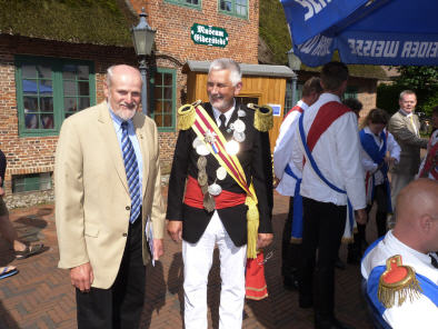 Reimer Hennings sprach mit Freude und Dankbarkeit von einem „Highlight op Eiderstedt“ und lobte die Kameradschaft und den Zusammenhalt unter den Ringreitern. Wenn auch das Landschaftsringreiten am 21. Juli den miserablen Wetterbedingungen zum Opfer fiel, freute er sich, dass das Ringreiten in den einzelnen Ortschaften hatte stattfinden können, und hoffte für heute auf gutes Wetter für die Durchführung des Wettbewerbes. Für den 16. September sei das Landschaftsringreiten in Tönning neu angesetzt. Heute habe man wegen des gestrigen Wetters auf Plan B ausweichen müssen, da der ursprünglich vorgesehene Platz einfach nicht geht.“ Reeden war’t egal wo, nur ni, wo dat schlubberig is.“ So muss der Wettbewerb im ersten Teil auf der Fenne an der Deichstraße auf der anderen Straßenseite gegenüber der Reitanlage ausgetragen werden. Gestern habe man umdisponiert und heute Morgen alles hergerichtet. Das Finale findet aber wie gewohnt auf dem Turnierplatz statt.