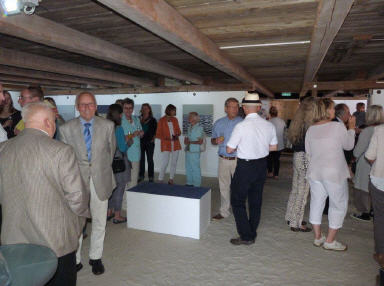 Kunstausstellung „Watt’n Meer!“ vom 7. Juli bis zum 2. September von Dienstag bis Sonntag jeweils 16:00 bis 19:00 Uhr verkündet das sich farblich abhebende große Schild rechts oben an der grauen Frontseite. Die Türflügel unter der Luke und der Hebevorrichtung für die Strandkörbe sind weit geöffnet. Im Eingangsflur über der Tür zu den vier großen Ausstellungsvierteln empfängt die Besucher das große Farbgebilde „Schwinge Morgenröte“ von Angelika Berger. Sie hat es aus dünner Seide in warmen Farben auf leichtem netzartigem Vorhangstoff gestaltet und erweckt Lust auf mehr. Die wird erfüllt, sobald man den Fuß in den ersten Teilraum gesetzt hat: Ausgewählte hervorragende Exponate, helle Wände, Licht von den Seiten, auf dem harten Betonboden eine lockere dünne Seesandschicht.