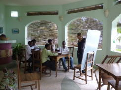 Von Juni bis September habe ich in einer Schule in Iambiani/Zansibar Sprachen unterrichtet. Die Schule, das JTTI (Iambiani Tourist Training Institut) liegt im Süden der Gewürzinsel Zanzibar an der Ostküste Afrikas. Diese Einrichtung will die “localpeople” befähigen, den Tourismus ihrer Küste selber in die Hand zu nehmen. Sie wird unterstützt von VSO, einer kanadischen Organisation für Auslandshilfe. In jedem Jahr werden 12 Schüler nach ausreichenden Englischkenntnissen ausgewählt und erhalten eine Ausbildung in allen Arbeiten, die in einem Hotel anfallen. So gab es neben dem Unterricht in Sprachen und im Hotelfach auch Kochkurse in der Küche und Ausbildung am PC und im Gebrauch des Internet. Alle Lehrer arbeiten dort ehrenamtlich.