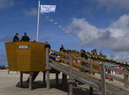 Möglich gemacht hatten dieses Ereignis Sascha Augustin und Oliver Grunau mit Erlebnis-Events St. Peter-Ording. Sie hatten alles Drumherum organisiert und mit Kirchengemeinde und Tourismuszentrale die Voraussetzungen für dieses Event geschaffen. Und bei Schlechtwetter hätte die Trauung in der kleinen Nikolai-Kirche in Ording stattgefunden.
