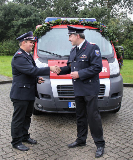 Endlich war es so weit! Der lang ersehnte Neun-Sitzer Bus, ein Fiat-Ducato, stand mit Girlanden geschmückt vor dem Feuerwehrgerätehaus. Wehrführer Norbert Bies hatte alle Spender dieses neuen, fast 27.000 Euro teuren Busses zur Schlüsselübergabe an die Jugendfeuerwehr ins Gerätehaus eingeladen. Den finanziellen Grundstock hatte die Big-Band der Bundeswehr im vergangenen Jahr mit ihrem Benefizkonzert auf der Buhne gelegt. Die großartige Band spielte umsonst und die Zuhörer warfen für diesen Hörgenuss ihre Spenden in die Sammelbüchsen der Jugendfeuerwehr. Dazu kamen dann viele weitere Spenden aus dem Ort.
