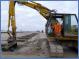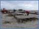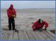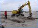 Fünf Mann sind mit den ersten Arbeiten für den Fahrradsteg beschäftigt. Reinhard Plähn von der Tourismus-Zentrale weist Lohnunternehmer Reinhard Merkner aus Kirchspiel Garding auf seinem Raupenbagger der 20 t Klasse kurz ein. Er soll die Träger für die abgebauten Stegelemente von den Sandmassen zwischen ihnen befreien, damit die dann nach entsprechender Herrichtung wieder aufgelegt werden können. Bis zum Abend, so denkt dieser, wird er seinen Auftrag erledigt haben.