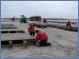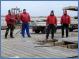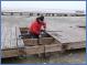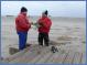 Weiter in Richtung Strand sind Thomas Hems, Rüdiger Manderla und Stephan Bielfeldt damit beschäftigt, die Stegelemente in einen ordnungsgemäßen Zustand zu bringen. Reinhard Plähn stößt nun zu ihnen. Diese Vier bilden das Team der Tourismuszentrale zur Wiederherstellung des Steges. So drei Wochen rechnen sie, wenn alles gut geht, Wind und Wetter mitspielen und Stürme mit Strandüberflutungen im Gefolge keinen Strich durch die Rechnung machen. „Eventuell müssen wir in Wathosen arbeiten. Hauptsache, der Steg bleibt liegen!“ so Thomas Hems, blickt kurz auf und arbeitet wie seine Teamkollegen weiter. Reinhard Plähn ist am Steg dabei, die Stegelemente mit neuer Verankerung zu versehen, die anderen drei sind mit der Vormontage der etwa 1 t schweren Elemente beschäftigt. Mit Hilfe des Radladers werden sie dann auf die Träger aufgelegt und gut befestigt. Bretter müssen da noch ersetzt und Lücken zwischen den Elementen geschlossen werden.