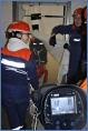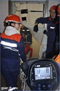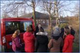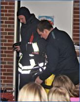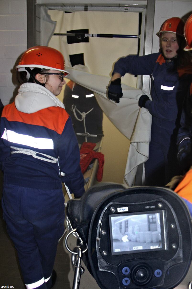 Der Jugendwart Tobias Thomsen versteckt in der Waschhalle der Feuerwache eine Puppe. Dann wird der Raum mit einer Nebelmaschine vernebelt. Draußen binden sich die jugendlichen Feuerwehrmänner und –frauen Seile um den Bauch. Zu zweit gehen sie in den Raum. Vor der Tür sichern zwei Kollegen die Seile. Jeweils drei von uns Schülern warten schon im Raum und halten das wichtigste Hilfsmittel in der Hand: die Wärmebildkamera. Mit ihr sieht man alles klar und deutlich. Die jungen Feuerwehrleute müssen durch diese Kamera schauen, um die Puppe zu suchen, sie auf eine Trage zu legen und zu bergen. Es schaffen alle.