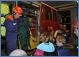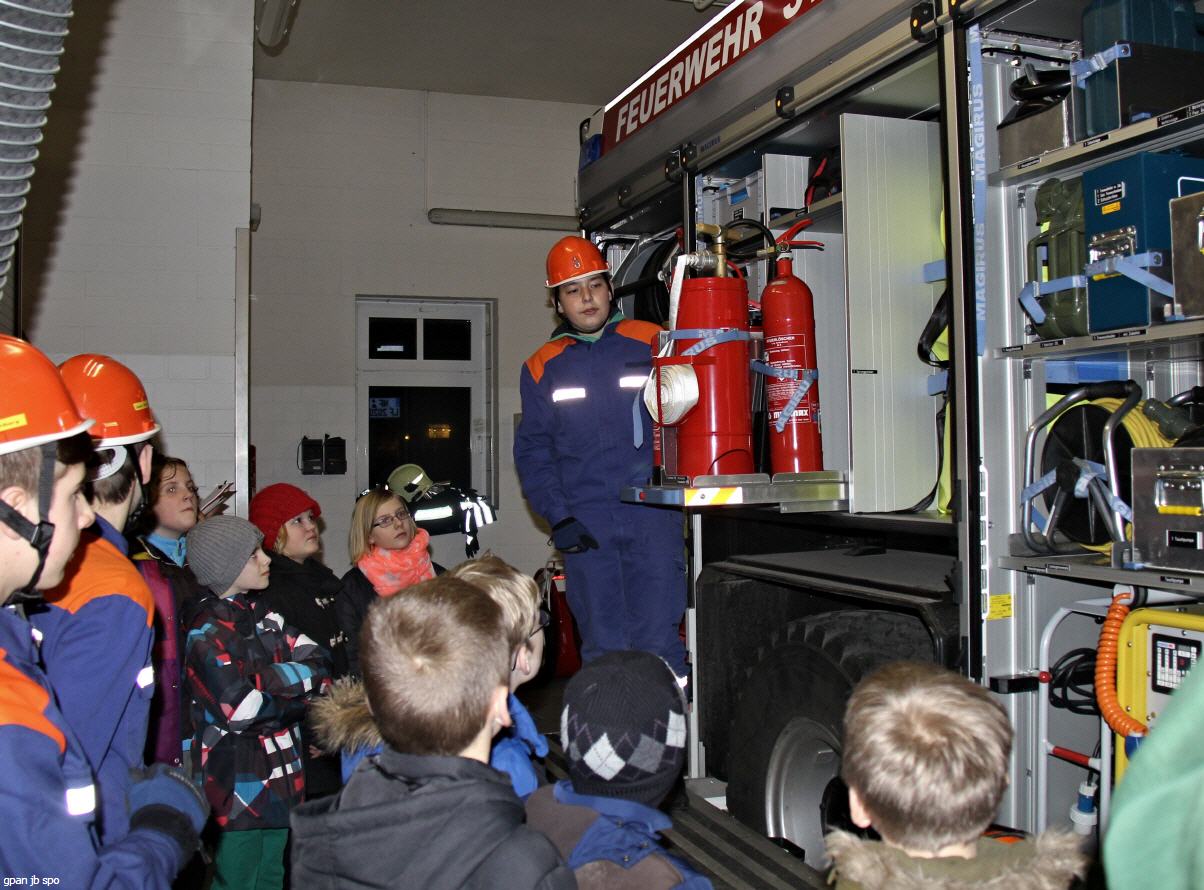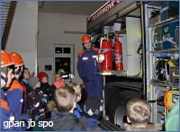 Später zeigen uns die Mädchen und Jungen der Jugendfeuerwehr dann ihren größten Feuerwehrwagen: das Hilfsleistungslöschgruppenfahrzeug (HLF/2020). „Das Fahrzeug ist unser ganzer Stolz. Es ist ganz neu und hat etwa 330 000 Euro gekostet, ungefähr so viel wie ein Einfamilienhaus“, erklärt uns Jugendwart Thomsen. Zur Ausrüstung gehören zum Beispiel eine Kettensäge mit Zubehör, ein 2000 Liter Wassertank und Hebekissen. Diese Hebekissen sind ganz klein, aber können bis zu 24 Tonnen tragen. Das ist mehr als alle Schüler unserer Schule zusammen wiegen. Auf dem Fahrzeug haben auch neun Personen Platz, der Gruppenführer, der Maschinist, ein Melder und sechs Feuerleute.