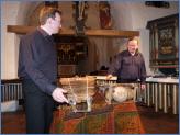 Fast unter dem Triumphkreuz hatten sie gespielt. „Geht denn das?“, mag mancher gedacht haben. Ein Osterkonzert mit diesen Instrumenten? Da denkt man schon eher an Choräle. Doch bei aller Traurigkeit über das Karfreitagsgeschehen ist Ostern ein Freudenfest für jeden Christenmenschen. Der auferstandene Christus ist Sinnbild der Lebendigkeit. Lebendig und voller Lebensfreude spielten die Schlagzeuger auf ihrem Lieblingsinstrument. Mit vollem Körpereinsatz brachten sie sich dabei ein. Dabei schien ihr Spiel so leicht! Doch der mehrfache Gebrauch ihres „Schweißtuches“ machte sichtbar, dass hier von den beiden Schwerstarbeit geleistet wurde.