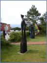 Vor etwa einem Monat, Anfang Juli, tat sich etwas im Vorgarten des Haenisch-Hauses direkt gegenüber der Dünen-Therme im Bad, Maleens Knoll Nr. 11. Galeristin Charlotte Feddersen-Menck aus Hamburg – Galerie Chaco – plante parallel zum Kitesurf World Cup in St. Peter-Ording dort die Sommerausstellung „BOARD OFF“. Aus Badow, 25 km westlich von Schwerin gelegen, war der Bildhauer Nando Kallweit mit seinem Mitarbeiter Klaus Ohde angereist, um draußen Installationen überlebensgroßer Skulpturen zu errichten. Sie fielen auf und zogen die Blicke an.