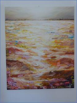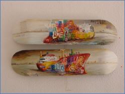 An den Wänden neueste Bilder von Jasmin Hilmer aus ihrer Serie Hamburg oder zum Thema Surfen. Farbenfroh, originell und ins Auge fallend präsentiert sie ihr „Hamburg“ oder ihre Eindrücke zum Surfen ganz unterschiedlich. Mal ist es der einsame Surfer, dann verloren auf dem Strand vor den mächtigen Wellen winzig klein Menschen. Oder Surfbretter - stehend, hoch gestapelt auf einem Bully bzw. ein schwarzer Hund auf rotem Brett.