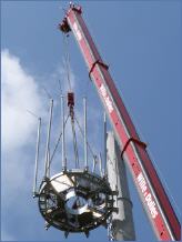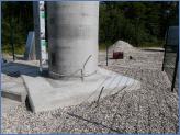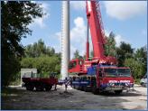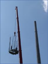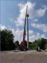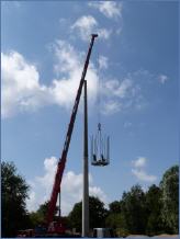 Vier Mitarbeiter der Firma Brake & Schepers aus Breddenberg im Emsland richteten den Schleuderbetonmast von 40,10 m Höhe mit Einsatz eines Teleskopkranes der Firma Wille & Dulies auf. Er besteht aus drei Betonfertigteilen und steht 2 m tief im Boden in einem Köcherfundament in einem eingezäunten Areal von etwa 200 m⊃2;. Der Bodendurchmesser des konisch zulaufenden Mastes beträgt 1,50 m. Der zur Herstellung verwendete hochwertige Schleuderbeton, bewehrt mit Betonstahl, korrodiert nicht. Nach dem Errichten wurde die Kopfbühne durch Überstülpen auf das 6 m hohe Teilstück des Mastes meisterhaft aufgesetzt. Drei Meter darüber wurde dann die zweite Plattform angebracht. Der Kran musste für das Aufsetzen der Bühne einen Schwenk von mehr als 180° vornehmen.