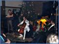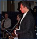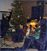 Davor aber Scheinwerfer und Notenständer, drei Stühle und ein Hocker von riesigen dunkelblauen Samttüchern verhüllt, die gleichzeitig den Altarraum irgendwie verwandelten; zusätzlich auf dem Hocker neben einem Ständer mit weißer Kerze ein Weinglas. So wurden die erwartungsfrohen Besucher empfangen. Es war kein Gottesdienst angesagt, und doch herrschte wenig später andächtige Stille im nur von den Tannenbaumkerzen, dem Licht in der Krippe und den Scheinwerfern beleuchteten Kirchenraum.