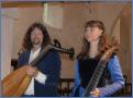 Im Chorraum lagen auf dem einen Teppichläufer eine Renaissance- und eine Barocklaute, 19- bzw. 24-saitig, und auf dem anderen eine kleinere Renaissance- (Schoß-) und eine größere Barock-Viola da Gamba (Kniegeige). Schon als sich Lutz Kirchhof hinter dem Altar einspielte, fühlten sich die Konzertbesucher in die höfische Zeit versetzt, das erst recht dann, als das Duo im Kirchenraum Platz genommen hatte. Er, mit seinem ausgeprägten Lockenkopf, schien ein fahrender Musikant und sie, in einem langen aus blauem und schwarzem Stoff gefertigten Kleid, eine musizierende Hofdame zu sein. Beider gekonntes Spiel versetzte dann endgültig in die Zeit der Renaissance und des Barock.