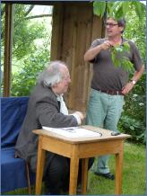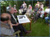 Es war wohl eher ein Geheimtipp, aber es kamen ganz viele von nah und fern. Und es war Bilderbuchwetter. So trafen sich zu einem fröhlichen Gartenfest höchst interessierte Besucher, Kunstfreunde, Künstler und Literaten. Zu den Lesungen gab es Vorführungen zum Drucken von Holzschnitten wie für das Buch und anderen Techniken.