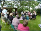 Im Garten unter den Schatten spendenden Bäumen lauschten die Gäste der markanten Stimme von Uwe Herms. Er las aus seiner Erzählung „Watt und Mond und Jadehase“. Es ist im Kern eine Liebeserklärung an Eiderstedt. Er beginnt sie so: „Kurz gesagt, für euch alle da draußen in der Welt: Rüsselartig schnufft unsere Halbinsel ins Meer hinaus, eine handfeste Drohung gegen die vorlaute See. ...“ Wenn man danach nicht auf die B 202 sondern durch Witzwort über Oldenswort, Warmhörn und Osterhever weiter nach Westerhever fährt, weiß man, was er uns in seiner Erzählung über dieses Eiderstedt mitteilen möchte. Die Holzschnitte von Manuel Knortz waren der Auslöser für seine Prosa. Der saß neben ihm, blätterte die Seiten weiter und spielte, sich in den Garten verabschiedend, melodiös auf seiner Flöte.
