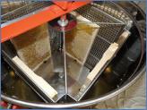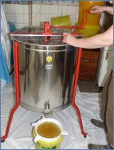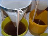 Da die Bienen die meisten Wabenzellen mit Wachs abgedichtet haben, müssen diese zunächst entdeckelt werden. Dafür hatte Bianca Ibs ihre Tochter Celina gewinnen können. Sie selber setzte dann jeweils vier, von den Wachsschichten befreite Rahmen im 90°-Winkel zueinander in die Schleuder, die sie per Hand betätigte. Der durch die Zentrifugalkraft aus den sechseckigen Wabenzellen heraus geschleuderte Honig sammelte sich unten im Zylinder und gelangte so über dessen Auslauf durch zwei feinporige Kunststoffsiebe als feinster Honig in die Eimer. Der erste Honig ist abgefüllt, zwei weitere Eimer warten noch drauf.