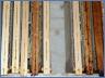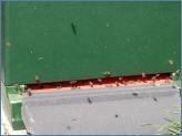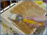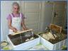 Den sechs Honigvölkern war es nicht so recht, als Neuimkerin Bianca Ibs ihnen die Kästen mit den Honigwaben nehmen wollte, aber trotz Verfolgung trug sie den Sieg davon. Ihre Küche hatte sie für die Honigernte hergerichtet. Vorne standen die geöffneten Honigkästen mit den gefüllten Wabenrahmen. In den einzelnen Waben befindet sich der Honig. Sein Feuchtigkeitsgehalt darf nicht mehr als 18% betragen. Der muss erst für jeden Honigraum bestimmt werden.