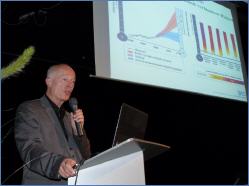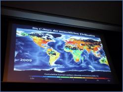 In einem höchst interessanten historischen Bogen von der Eiszeit bis heute stellte Prof. Schellnhuber in schlichter und eindrucksvoller Weise naturwissenschaftliche Grundlagen vor. Mit ihnen zeigte er auf, wie seit Beginn der Sesshaftigkeit vor 15000 Jahren die Erdbevölkerung zugenommen hat und wie sich ihr Handeln seit der industriellen Revolution in der Kohlenstoff-Story der menschlichen Zivilisation zerstörend auf die Umwelt ausgewirkt hat. „Physik ist Realität. Darauf beruht die technische Zivilisation“, so sagte er. Wenn wir so weiter machten wie bisher, werde die Temperatur bis 2100 um 4° bis 5°C steigen. Ein Meeresspiegelanstieg um 20 m wäre unser Ende. Gelänge es hingegen, den Temperaturanstieg auf 2°C zu begrenzen, bedeutete das immer noch einen globalen Meeresspiegelanstieg um eineinhalb Meter. Geophysikalische Gesetze lassen das mit 95-98%iger Wahrscheinlichkeit voraussagen. In der Westantarktis hat offenbar bereits ein unumkehrbares Abschmelzen des Eises eingesetzt.