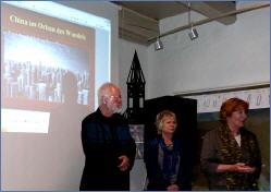 In der sich anschließenden Diskussionsrunde beantworteten Jürgen und Helga Bertram gemeinsam die Fragen aus der Publikumsrunde. Leben bei ständiger Gegenwart von staatlicher Kontrolle, ein-Kind-Politik, Missbrauch durch unkontrollierte Machthaber, Konsequenzen für die Zukunft waren nur einige der Themen. Jürgen Bertram ist überzeugt, dass sich China in Zukunft nur über eine Demokratisierung weiter entwickeln könne. Innerhalb des Parteiapparates und der Unternehmen könnten moderate Kräfte tätig werden. Aber die Größe des Landes bereite diesen Gruppen hinsichtlich Kooperation und Koordination enorme Schwierigkeiten. Im Pragmatismus der Chinesen aber läge auch hier die Chance für Veränderungen.