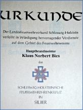 Der Anlass war festlich und passte zum traditionellen Adventsball der Freiwilligen Feuerwehr Sankt Peter-Ording in der Utholm-Halle. Die Festversammlung gratulierte ihrem Wehrführer Norbert Bies von der Gemeindefeuerwehr herzlich mit großem Beifall. Für den Vorstand des Kreisfeuerwehrverbandes Nordfriesland hatte ihn Matthias Trapp zuvor mit dem Schleswig-Holsteinischen Feuerwehr-Ehrenkreuz in Silber ausgezeichnet. Mit der dazu gehörigen Urkunde würdigt der Landesfeuerwehrverband Schleswig-Holstein Hauptbrandmeister Klaus Norbert Bies für hervorragende Verdienste auf dem Gebiet des Feuerwehrwesens.