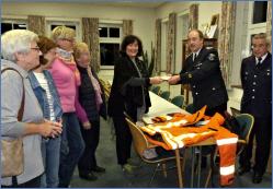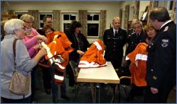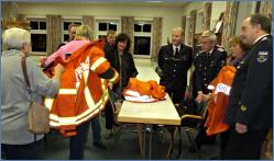 Wehrführer Norbert Bies und seine Kameraden der Freiwilligen Feuerwehr St. Peter-Ording freuten sich doppelt über den Besuch von Renate Maassen und ihren Mitlandfrauen im Feuerwehrgerätehaus. Schließlich hatten diese nicht nur eine großzügige Spende aus dem Erlös durch den Tortenverkauf am Tag der Deutschen Einheit im ev. Gemeindezentrum dabei (wir berichteten), sondern sie zeigten sich auch höchst interessiert an der Beschaffenheit der Einsatzschutzbekleidung. Die wurde von allen Seiten begutachtet. Marlies Voß konnte der Verlockung nicht widerstehen und zog sich eine Jacke an. Die stand ihr ausgezeichnet. Sie hätte glatt als Feuerwehrkameradin mit in einen Einsatz gehen können. Davon nahmen die Eiderstedter Landfrauen dann doch lieber Abstand. Sie bedankten sich ausdrücklich für die stete Bereitschaft der 64 Aktiven der Wehr und freuten sich, die Feuerwehr auf ihre Art unterstützen zu können, eben durch Backen und Verkaufen von Torten und Kaffee.
