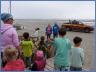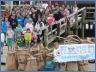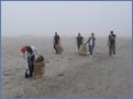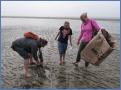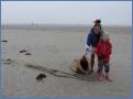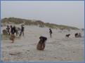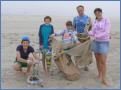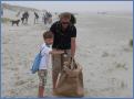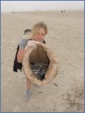 So eingestimmt auf die besondere Bedeutung dieser Strandmüllsammelaktion gingen die Teilnehmer, darunter auch jeweils viele von den unterstützenden Hotels und den Kooperationspartnern, über die Badbrücke Richtung Strand. An deren Ende warteten Johannes Mahnsen und Nils Trußner vom Strandteam der TZ und verteilten die stabilen Restmülltüten. Jeweils etwa zur Hälfte wurden die Müllsammler hoch motiviert über den Strand in Richtung Spülsaum bzw. Dünenrand geschickt. Schnell hatten sich diejenigen für den Seebereich verteilt, diejenigen an den Dünen bewegten sich in einem Trupp Meter für Meter vorwärts. Plastik von Styropor bis Deckel-oder Behälterresten fand sich überall, ebenso Taureste in Orange, Blau und Grün verheddert in trockenem Seetang, aber auch Glasflaschen, Getränkedosen, Bretter mit Nägeln, Kinderschuhe, Riesentaue oder Netzreste bis in den Schlicksandboden, Blechdosen, Tetrapacks und vieles mehr. Sogar ein Gebissteil für den Unterkiefer war unter dem Sammelgut. Eifrig waren alle dabei. Vor allem für die vielen Kinder war es ein Erlebnis. Sandra und Florian Bötticher aus Jesteburg waren mit ihren drei Jungs Finn, Mika - wegen einer Knieverletzung sogar auf Gehhilfen - und Levi im Seebereich unterwegs. „Wir fanden das letztes Jahr schon so toll, da sind wir gleich wieder gekommen. Wir sind gerne in St. Peter und hatten uns für unseren Urlaub im Internet informiert, ob so eine Aktion stattfindet. Schön, dass es dieses Jahr so viele sind, wohl dreimal so viel.“