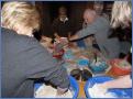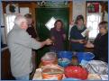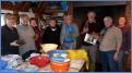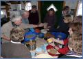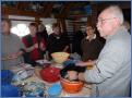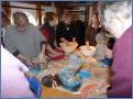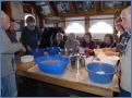 Mit großem Interesse waren sie aus Högel, Langenhorn, Tönning, Kotzenbüll, Tating und St. Peter-Ording ins Backhaus gekommen. Mehr hätten es auch nicht sein können um den Tisch in dem für diese Anzahl kleinen Raum vor dem Backofen, der aus den geöffneten Türen noch reichlich Restwärme vom Backvorgang abstrahlte. Den Teig sollten die Teilnehmer mit nach Hause nehmen und ihr Brot dann dort selber backen. Aber jeder sollte doch ein frisches Brot für den Abend mitnehmen. Die hatten Mitglieder des Backhaus-Teams bereits gebacken. Dazu war der Vorteig entsprechend rechtzeitig angesetzt worden. Er muss mindestens zwölf Stunden stehen, auch zwanzig und mehr Stunden schaden nicht. Horst Dammann und Alt-Bäckermeister Hans Siercks wie seine Backhauskameraden hatten deswegen auch schon vorher viel Zeit investieren müssen. Der Backofen war bereits am Vortag wegen der winterlichen Temperaturen schon einmal vorgeheizt und am Seminartag ab 9:00 Uhr angeheizt worden. Zu Seminarbeginn um 14:00 Uhr waren die Brote fertig gebacken und kühlten auf dem Bord aus.