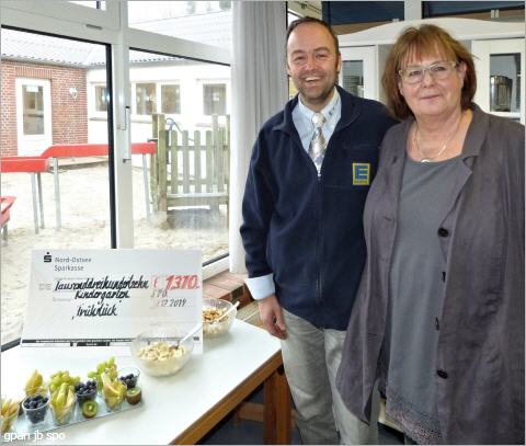 „Was könnte man Sinnvolles für die Kita tun?“, hatte sich Karsten Johst vor zehn Jahren gefragt und im Gespräch mit Kita-Leiterin Brigitte Ranft-Ziniel die Frühstücksidee entwickelt. Seitdem sponsert sein EDEKA-Lebensmittelmarkt das Frühstück. Den Scheck im Wert von 1310 € für dieses Jahr hatte er bereits übergeben. Er freute sich wieder einmal, als er sehen konnte, wie die Kinder dieses Angebot wahrnehmen. Dank seines Engagements beträgt der Kostenbeitrag der Eltern pro Kind im Monat nur fünf Euro. Das sind gerade einmal 20 Cent pro Frühstück mit einem qualitativ hohen Standard. Über 10.000 € sind in dem Zeitraum nicht nur im Sinne einer gesunden Ernährung, sondern auch für die Ausbildung eines Ernährungsbewusstseins sehr gut angelegtes Geld. Das abwechslungsreiche Angebot schafft Anreize zur Auswahl. Kindliche Neugier und Begeisterung verringern Hemmschwellen und bringen die Kinder auf den Geschmack, sich ihre Portion mal wieder anders zusammen zu stellen. Im Laufe der Jahre hat sich die Form des Frühstücks laufend verändert, so dass der Reiz auch immer wieder neu entfacht wird.