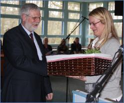 Rainer Balsmeier erinnerte als Schulverbandsvorsteher an wichtige Projekte aus den fünf Jahren der Amtszeit von OStD Ramm: Neuer Fachtrakt, Schulhofgestaltung, das Gymnasium mit dem Regionalschulteil wurde ein Gymnasium mit Gemeinschaftsschulteil, Schulsozialarbeit auch am Gymnasium. „Sie waren Manager und wichtigster Ideengeber!“ Da er gerne mit ihm zusammen gearbeitet habe, sei er etwas enttäuscht gewesen, dass OStD Ramm eine andere Schule übernehmen wolle. Mit einer Karte für die Dünentherme wolle er ihn aber gerne ab und zu nach St. Peter-Ording locken.