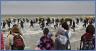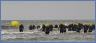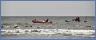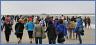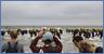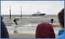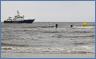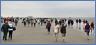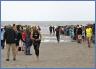 Recht warm, aber bedeckter Himmel. Während die "Jederfrauen und -männer" schon auf ihren Rädern unterwegs sind, sammeln sich die Teilnehmer der "Olympischen Distanz" am Startplatz in der Nähe des Pfahlbaues "Silbermöve". Einige müssen sich doch noch auf den letzten Metern beeilen, denn sie haben die Entfernung am Strand unterschätzt. Starter Georg Werner Jensen behält die Übersicht von seinem Kastenwagen aus und gibt ruhig seine Anweisungen. Dann ist es so weit. Viele Zuschauer haben sich eingefunden. Alle wollen so nah wie möglich an die Startenden heran, um ein spektakuläres Erinnerungsfoto zu schießen. Danach begleiten sie die Schwimmer an der Flutkante. Man muss schon recht schnell gehen, um mit dem ersten Schwimmer auf gleicher Höhe zu bleiben.