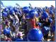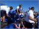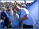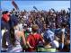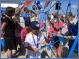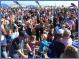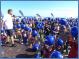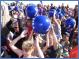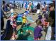 Doch wozu lagen in den großen Netzen hinter und neben der Bühne insgesamt über 750 blaue aufgeblasene Nivea-Wasserbälle? Das sollte mit „Joyrobic“ der Höhepunkt beim Strandfest werden. Mit Moderatorin Mone wurde nach Aufstellung in einem riesigen Außen- und einem kleineren Innenkreis dazu der „Lambalu-Tanz“ mit hintereinander Händen über dem Kopf, auf der Schulter des Nachbarn oder am eigenen Knie eingeübt. Aus den Kreisen entwickelten sich mit Hilfe der Teammitglieder lange Schlangen, die sich zur Bühne hin ausrichteten. Danach gab es die Ballanweisung, und die Bälle konnten ausgegeben werden. Das klappte super über den Kopf von vorn nach hinten, so dass jedes Kind seinen Nivea-Ball erhielt. Diejenigen, die dabei versehentlich keinen abbekommen hatten, konnten sich am Ende auch noch ihren Ball abholen.