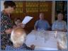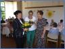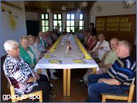 Danach nehmen sie am Tisch mit Platz, denn Waltraud Rüß trägt noch eine Geschichte vor und ein Gedicht gibt es als Zugabe. Einfach schön! Sie überreicht beiden dann je einen hübschen kleinen Blumenstrauß. Der wird aus dem Schweinchen finanziert, das so nebenbei rumgegangen ist. Die beiden freuen sich darüber sehr, besonders natürlich, weil ihnen wieder ein „Tischlein deck dich“ gelungen ist.