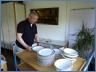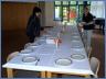 Meistens wird am Abend vorher die Tafel vorbereitet. Dieses Mal war am Montagabend eine Veranstaltung, so dass es erst morgens losgehen konnte. Ruckzuck innerhalb einer halben Stunde hatte das eingespielte Team des Ehepaares – inzwischen 46 Jahre verheiratet – die Tafel aus Einzeltischen und Platten für 26 erwartete Gäste zusammengestellt, mit weißen Leinendecken versehen und mittig darauf Blumenschmuck aus dem eigenen Garten verteilt sowie Kerzen hingestellt und mit Goldrandgeschirr gedeckt. Dieses stammt aus dem Hause ihrer Schwiegermutter und ist mit allen Terrinen, Platten und sonstigem Zubehör in einem Extraschrank im Seniorenraum untergebracht. Fast passend darüber hängt ein Relief aus Messing mit der Darstellung des Abendmahls. Außer dem Geschirr wird alles Zubehör von Zuhause mitgebracht und natürlich auch das, was dort schon vorbereitet werden kann. Denn die kleine Küche im Gemeindezentrum macht wohl manches aber nicht alles möglich. Bernd Maassen erhält noch zwei Einkaufsaufträge. Die erledigt er zügig und zieht sich dann nach Hause zurück. Er hat seinen Teil zum Gelingen beigetragen.