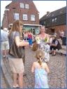 Insgesamt 36 Stände gab es im Halbrund um die St. Christian-Kirche zur Engen Straße und zur Tourismuszentrale hin. Neben Darbietungen auf der Bühne davor, auch von den Gardinger Music Kids unter Leitung von Elisabeth Weißenberger, gab es vor allem Leckeres für Gaumen, Zunge und Magen. Aber auch der informative Eiderstedter Kulturreiseführer 2013 war für 5,00 € bei Margot Herzberg und Ingeborg Herms im Angebot. Lammkönigin Melanie Harrsen stellte sich vor, Gudrun Fuchs und Christiane Sass in Eiderstedter Frauentracht begleiteten sie auf ihrem Rundgang mit den Losen für die Tombola über den Markt. Dörte Rickerts sorgte während des Nachmittags für die Moderation. Der Erlös des Spezi-Marktes der Landfrauen wird dieses Jahr die musikalische Jugendarbeit im kirchlichen Bereich auf Eiderstedt sponsern. Eine gute Entscheidung!