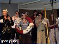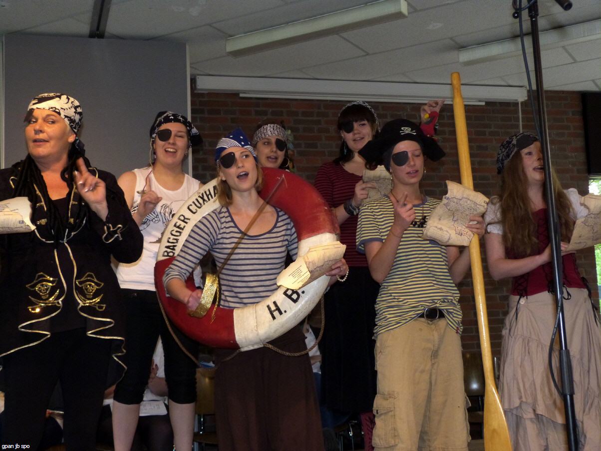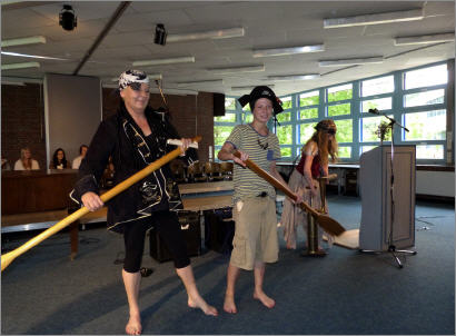 Nach „Caravan of Love“ des Chores enterte mit „Hey Ho!“ eine Gruppe von Piratinnen mit ihrer Kapitänin Ruth Thomas, Schulelternbeiratsvorsitzende, die Aula. „Mit „Ihr seid geentert und nicht gekentert“ gratulierte sie der Crew vom Deich zum Abi, wünschte Erfolg auf dem künftigen Weg und bat: „Taucht wieder auf, wir sind immer für Euch da!“ – „Leinen los!“ hieß es dann.