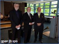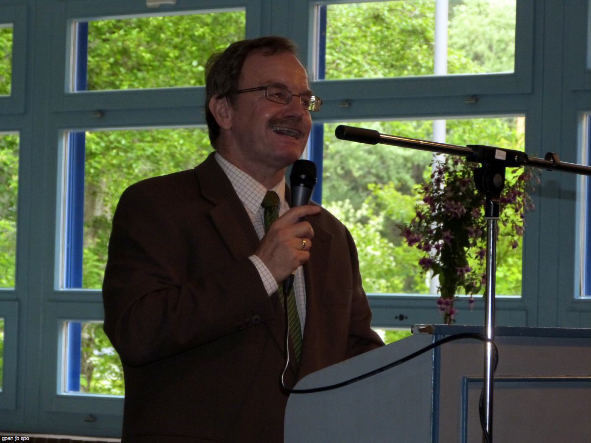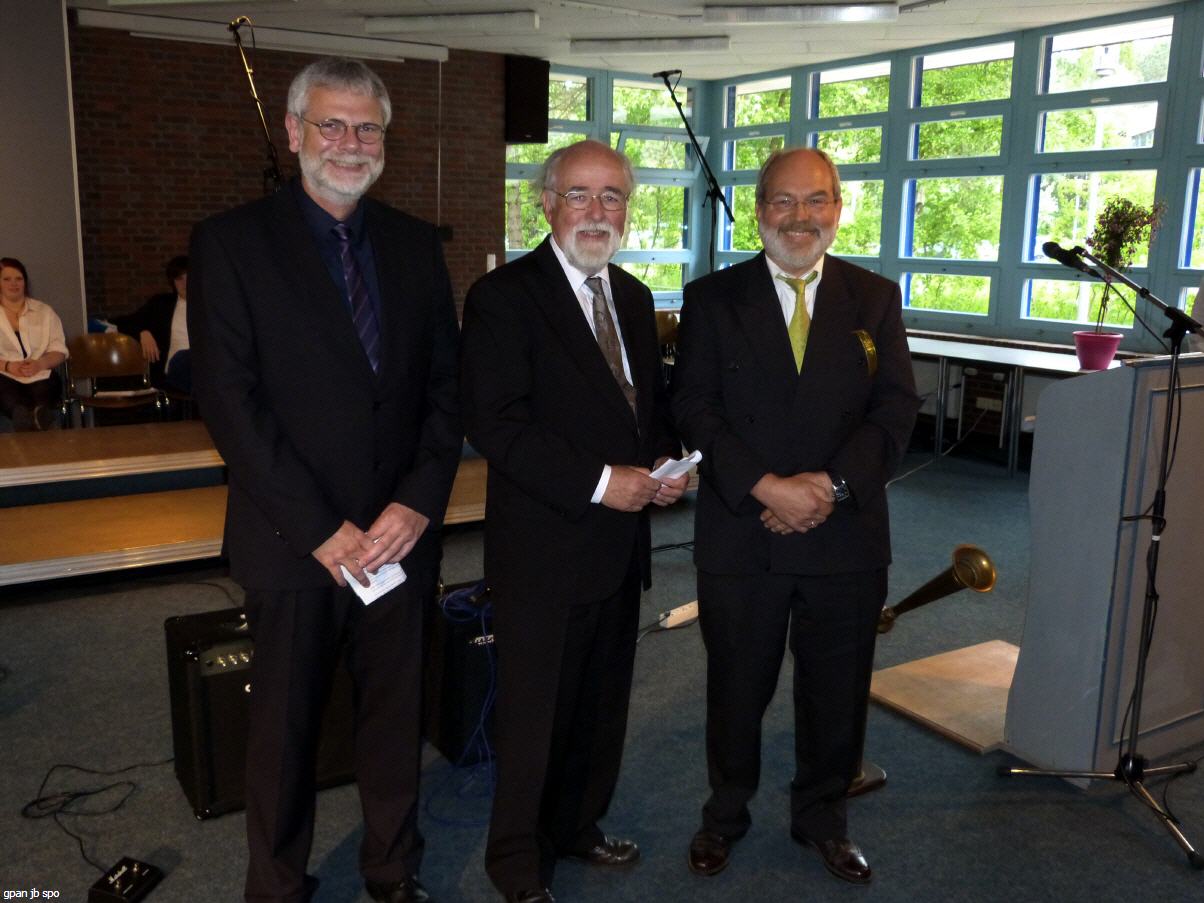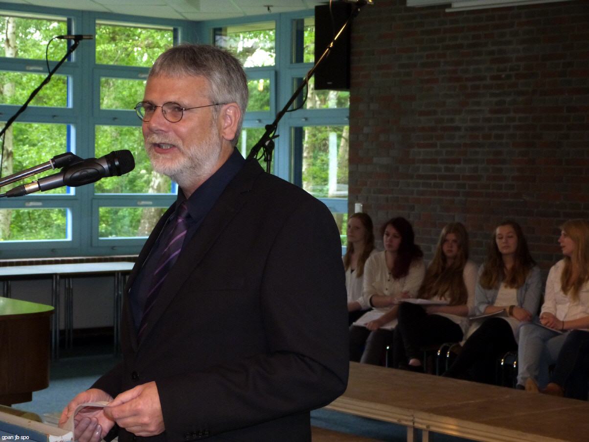 Nach den Reden der beiden Klassenlehrer war es für Bernd Reppmann ein geeigneter Zeitpunkt, den nebenamtlichen Religionslehrer Pastor Dr. Gerd Rosenbrock mit herzlichen Dankesworten nach acht Jahren Tätigkeit aus dem Kollegium zu verabschieden. Er ging auf dessen wechselvollen Weg von Bonn über Stade nach Aachen, Kerpen, Hagen und schließlich nach Eiderstedt ein und lobte seine ausgesprochene Vielseitigkeit. Ein Extradank ging an ihn für die Anregung und Durchführung der Gottesdienste in der St. Peter-Kirche vor den Abi-Entlassfeiern.
