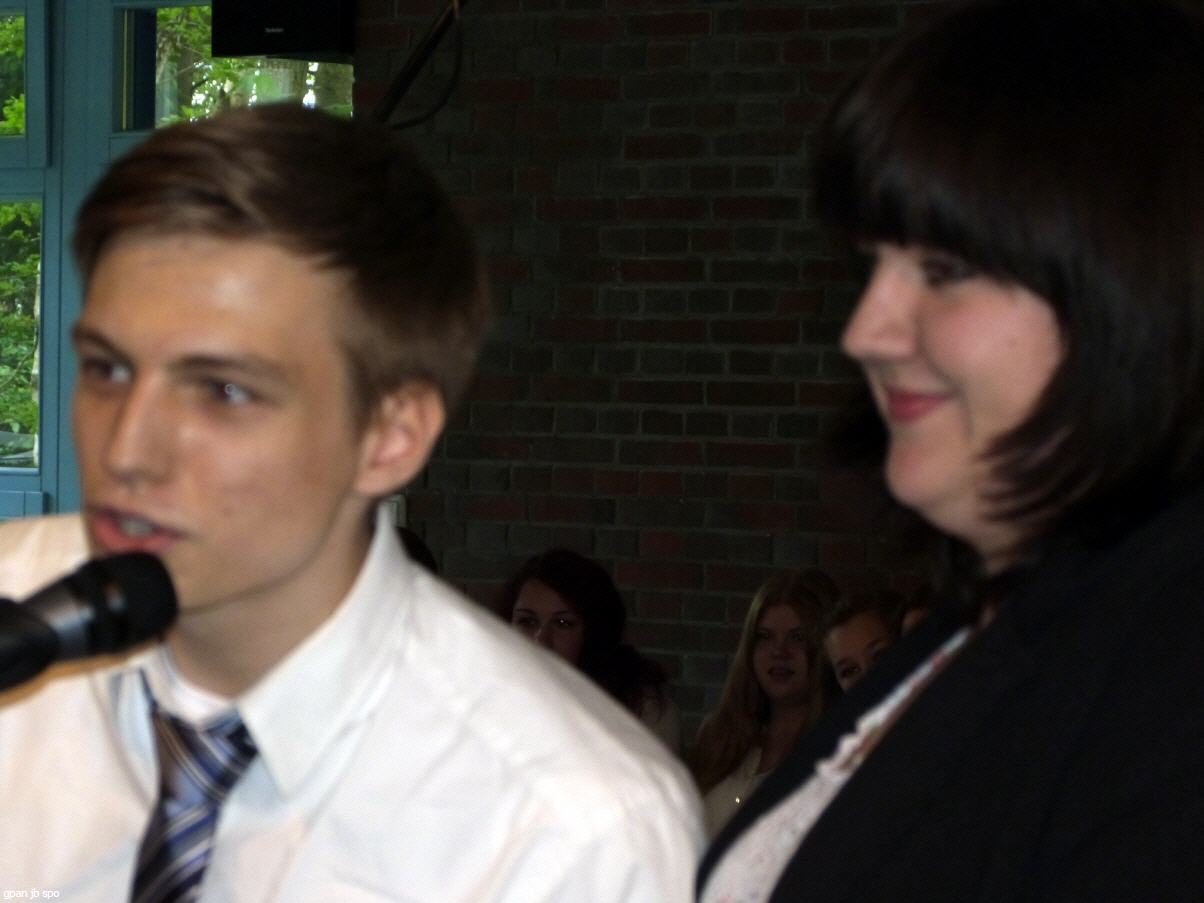 „Adiemus“ von Karl Jenkins stimmte ein auf die Ansprache der Abiturienten durch Alina Ehrhardt (13 b) aus Tönning und Klaas Birkenbach (13 a) aus Garding.- Ihre fröhliche Begrüßung mit „Moini“ und „Ey yay yo“ versetzte in den Schulalltagsmorgen, den die beiden dann rückblickend auf neun gemeinsame Schuljahre passieren ließen, in denen sie auch schon vor der Studienfahrt von vermeintlichen „Hells Angels“ und „Bandidos“ zu „Alle für einen und einer für alle“ zusammen gewachsen waren. „Unsere Schulzeit war unvergesslich, und jeder weiß: Niemand stoppt die Crew vom Deich!“ war ihr großes Dankeschön an die Schulzeit mit der unterstützenden Begleitung durch Eltern und Lehrkräfte.