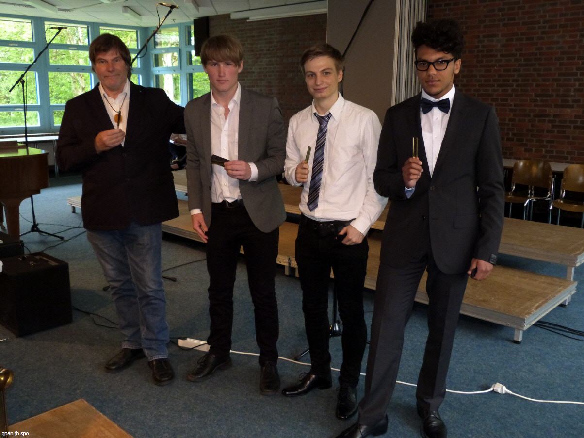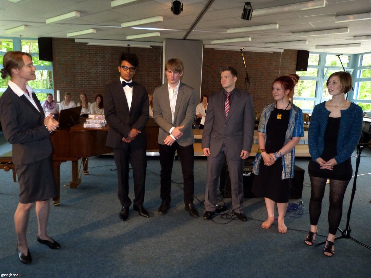 Christine Melzer bedankte sich bei Finn Felix Brauer, Nanke Stöhrmann und Frauke Mumm wie auch bei Torge und Olyana mit persönlichen Worten für die jahrelange Mitarbeit in den verschiedenen Musikgruppen der Schule und überreichte jedem das Buch „Vom Klang der Zeit“. Dr. Thomas Pickhardt ehrte Franziska Reimers für ihre schauspielerischen Leistungen über viele Jahre in der Theater-AG.