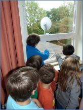 Germanwatch greift dazu Ideen von Geoscopia auf, mit dem Einsatz von Satellitentechnik ein neues Medium im Unterricht für eine nachhaltige Umweltbildung nutzbar zu machen. Thomas Rahne von Geoscopia, Geograph und Meteorologe, hatte dazu seinen Computer extra an eine Satellitenschüssel zum Empfang von Bildern des Erdbeobachtungssatelliten Meteosat 9 auf dem Dach vor dem Erdkunde-Fachraum angeschlossen. Dessen geostationäre Position bei 0° geographischer Länge im Erdabstand von ca. 36.000 km über dem Äquator ist für die Wetterbeobachtung über Afrika, dem östlichen Atlantik und Südeuropa optimal. So wird der Blick vom Weltall auf die Erde direkt ins Klassenzimmer geholt. Selbst der Blick auf St. Peter-Ording war möglich. Das war so recht etwas für die Jungen und Mädchen der fünften Klasse; der elfte Jahrgang nahm das eher gelassen auf.