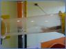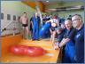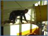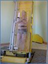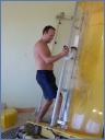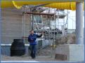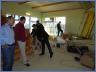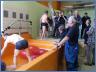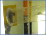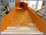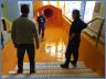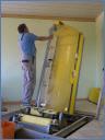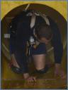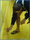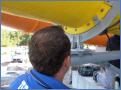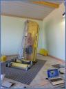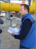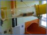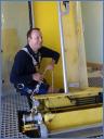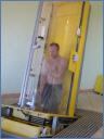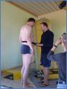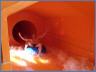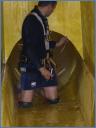 Daran schloss sich zunächst die Trockenabnahme der beiden Rutschen an. Für die Reifenrutsche mit 91,22 m Länge war das durch TÜV-Gerätesicherheitsprüfer Storch, den 64jährigen „Altmeister“, schon geschehen. Sperlich machte sich nun für den Trockendurchgang durch die Turborutsche fertig. Angeseilt, mit Knieschützern und Stift versehen, stieg er, mit den Augen überall, in den 70° Fallschacht und kroch dann abgeschnallt nach den ersten Abseilmetern auf Knien mit Rundumblick durch das insgesamt 41,55 m lange Rutschenrohr mit noch 10 m Auslauf am Ende. Den siebzehn Fugen galt dabei sein besonderes Augenmerk, denn die Kanten darf man wegen sonst möglichen Verletzungsrisikos überhaupt nicht spüren. Man hörte es durch ihn im Rohr leicht qietschen und rubbeln. „Die Fugen erkennt man nicht“, so sagte er ganz leise im Selbstgespräch. „Da bin ich beeindruckt!“