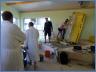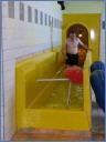 Die Vorbereitungen liefen an. „Wasser marsch!“ hieß es. Georg Römer, Nils Koch und weitere Mitarbeiter der TZ, unter ihnen auch Christina Bratz machten sich in Badebekleidung für die Rutschversuche bereit. Die Reinigung vom Bauschmutz in den Ausläufen gemäß dem Sicherheitsgebot der drei „S“ – Sicherheit, Sauberkeit, Service – war vorweggegangen. Es rauschte nun im Reifenrutschenrohr und im Auslaufkanal schwoll das Wasser an. Blaue treckergroße Reifen und ein roter Zweierreifen lagen bereit. Das mittelschwere Rutschenspektakel konnte beginnen. Begeistert waren nicht nur die Testpersonen, auch den Handwerkern machte das Zuschauen sichtlich Spaß. Das war Abwechslung pur beim Arbeitsalltag so kurz vor der Mittagspause.
