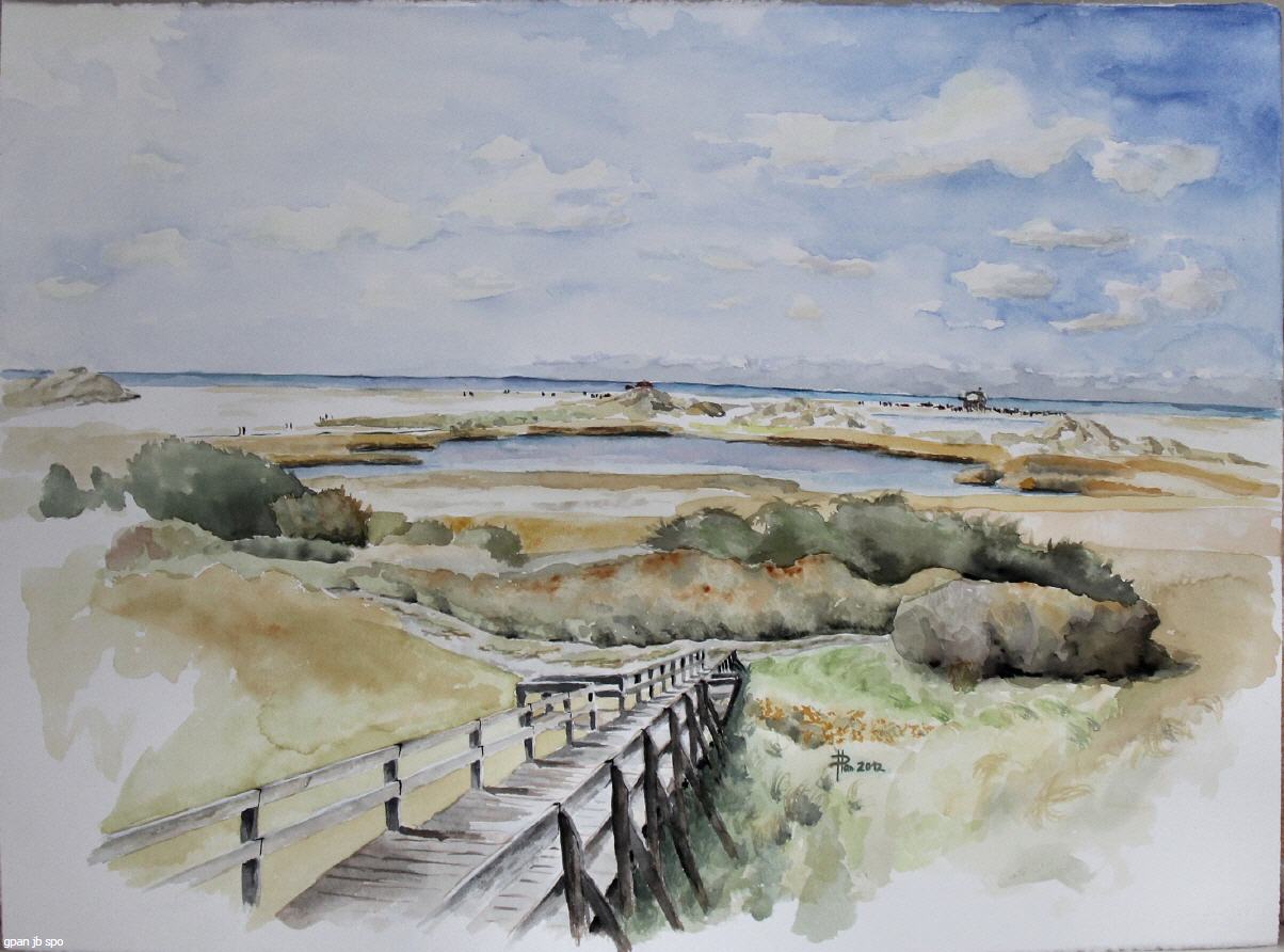Ich sitze im Sand leicht oberhalb einer Bucht am Mittelmeer. Ganz versunken will ich den Pinsel in das schmale Glas Wasser tauchen, als meine Hand etwas Feuchtes berührt. Ich schaue erschrocken hoch. Eine große Hundeschnauze scheint an meiner Hand kleben zu bleiben, dann nähert sie sich mit dem übrigen Hund meinem Malblock. Ich gerate ein wenig in Panik, denn ich kann dem Hund nicht ansehen, ob er ruhig bleiben oder aggressiv werden wird. Aus den Augenwinkeln sehe ich eine Frau in Badelatschen und Badetasche kurz hinter mir. Verärgert sage ich: "Nehmen Sie doch Ihren Hund zurück!" Keine Reaktion. Der Hund wuselt mit seiner Schnauze und seinem Fell über das Blatt Papier. "Bitte halten Sie doch Ihren Hund fest!" Die Dame schaut auf mich herunter, schiebt ihre Sonnenbrille ein wenig hoch, lächelt mich an: "Ich habe keinen Hund. Der hier ist aber sehr kunstinteressiert, erstaunlich!" Und schon geht sie mit leichten Schritten hinunter zur Bucht. Der Hund dreht sich ebenfalls um und verschwindet in den kleinen Kiefern an den Dünen. Und ich? Ich hatte Glück gehabt. Die Farben waren nicht verwischt, denn bei der Sonne trockneten sie sofort. Aber diese ersten Farbtupfer gefielen mir jetzt gar nicht mehr. Also weiter bis zu einem besseren und hoffentlich ungestörten Malplatz.