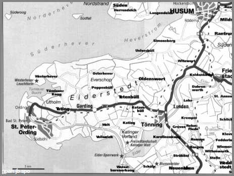 Auf der Halbinsel Eiderstedt springt ihr westlichster Ort, das Bad St. Peter-Ording, bis zur Insellinie Pellworm-Föhr-Römö vor.