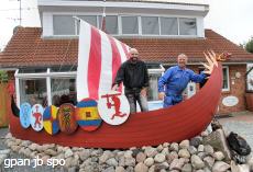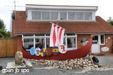 Erhard Schiel hat sich einen weiteren kleinen Traum erfüllt, ein „Wikingerboot“. Ein altes Boot aus Friedrichstadt, das er geschenkt bekam, brachte ihn auf die Idee. Es liegt jetzt umgebaut als Wikingerboot in der Bövergeest leicht schräg auf Steinen, ein weiterer Blickfang vor seiner Galerie. Fachmännische Hilfe erhielt er durch Nachbarn, Schiel selber konzentrierte sich auf die Gestaltung und Bemalung. Symbolisch steht es für Abenteuerlust und Wagnis. „Ich lese viel über das Leben unserer Vorfahren, interessiere mich für Geschichte, auch für die der Wikinger. Sie waren ja nicht nur Krieger und Plünderer, sie waren auch Bauern und Handwerker, Kaufleute und Entdecker. Ohne ihre besonders schönen und technisch ausgereiften Schiffe hätten sie nie ihre weiten Fahrten über die Meere unternehmen können.“